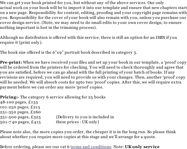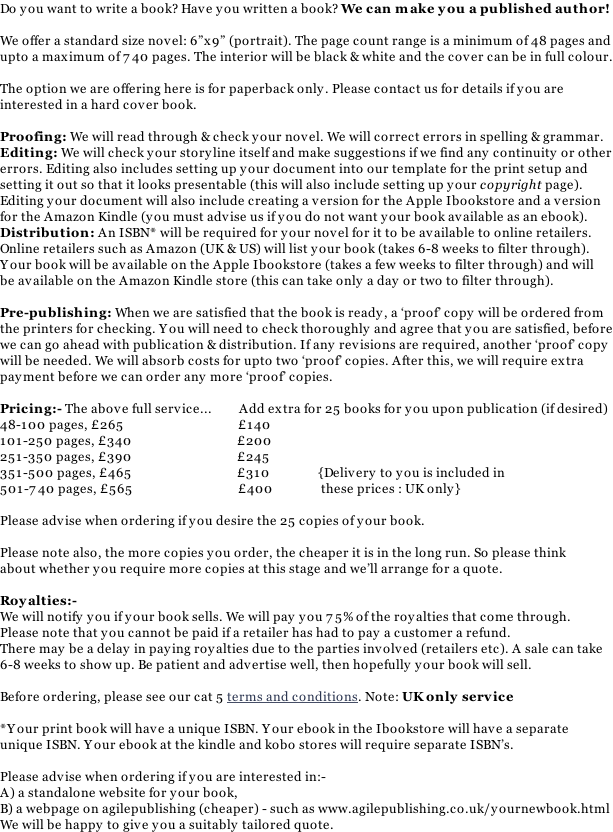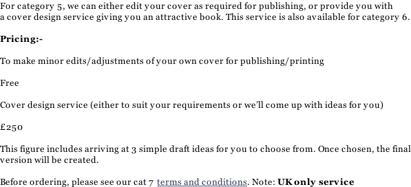 Orders, queries Category 5 Novel proofing, editing, publishing & online distribution (includes ebook) Category 6 Novel only (no proofing, editing, distribution or ebook) Category 7 Cover design Books